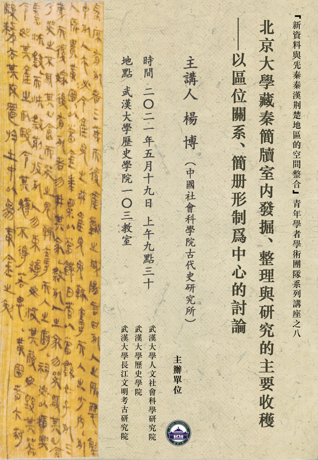 2021年5月19日上午,中国社科院古代史研究所杨博先生应邀在365best103教室做了题为《北京大学藏秦简牍室内发掘、整理与研究的主要收获——以区位关系、简册形制为中心的讨论》的专题学术讲座。本次讲座为“新资料与先秦秦汉荆楚地区空间整合”青年学术团队系列讲座第八场。