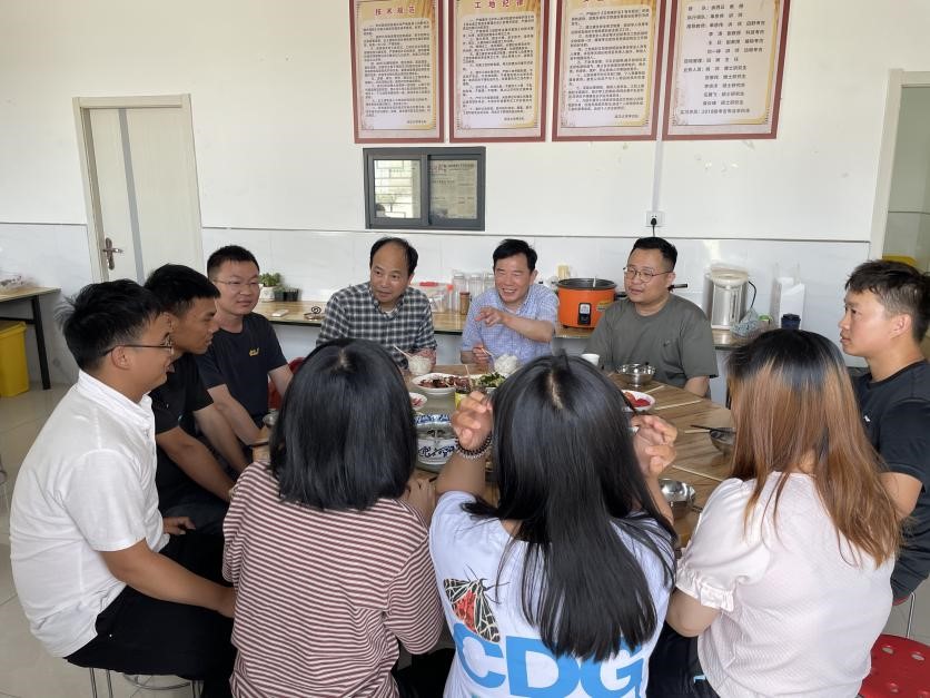 刘礼堂书记一行首先去往凤凰咀文物管理库房,对目前文物出土情况进行了详细的询问。随后,刘礼堂书记一行走访了襄阳凤凰咀考古工地,在工地实习的同学们热情地向刘书记介绍凤凰咀考古基地的发掘情况,刘书记亲切询问同学们的学习生活状况,提醒同学们发掘时注意安全,勉励在场考古系师生,把握实习条件,掌握专业知识,从而提升自己的学习和科研能力。最后,刘礼堂书记一行和同学们在食堂共进午餐,同学们向刘书记讲述工作站的趣事,刘书记也和同学们分享了自己以前的考古工作经历,大家其乐融融。