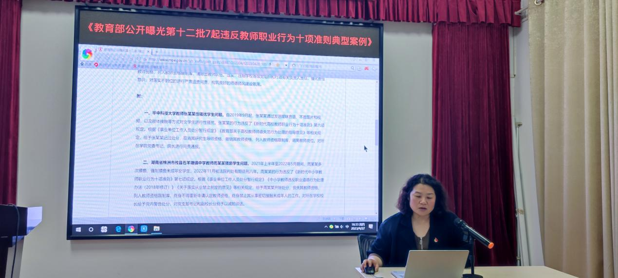 师德师风是教师队伍素质的第一标准。为加强师德师风建设,全面提升教师队伍思想政治素质与道德水平,4月27日下午,学院党委副书记刘超带领学院班子成员、党委委员、党支部委员、教师代表共同学习《教育部公开曝光第十二批7起违反教师职业行为十项准则典型案例》。刘超副书记对案例进行了解读,强调教师队伍要提高思想站位,要以本次教育部曝光违反教师职业行为十项准则典型案例为戒,进一步加强学习,提高自身素质修养。